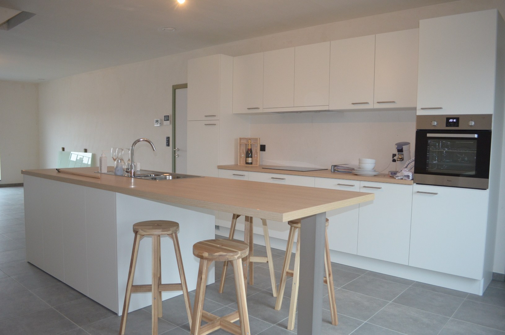Indeling : inkomhall, gastentoilet, ruime woonkamer met open keuken (keukenmeubel met eiland en ontbijttafel voorzien van kookvuur, dampkap, oven, frigo en afwasmachine) en aansluitend groot terras, ruime berging & wasplaats, nachthall, twee zeer ruime slaapkamers, apart toilet en badkamer ( badkamermeubel met dubbele wasbak, ligbad en inloopdouche).