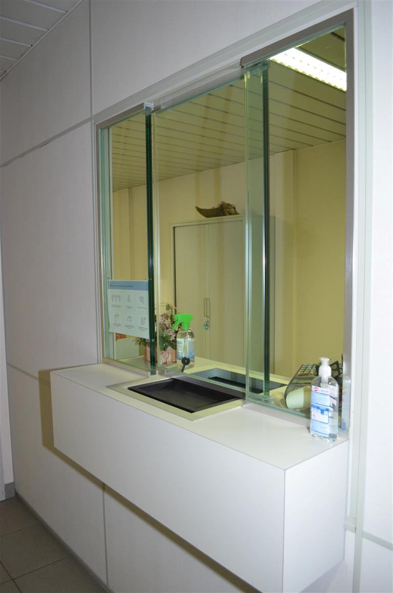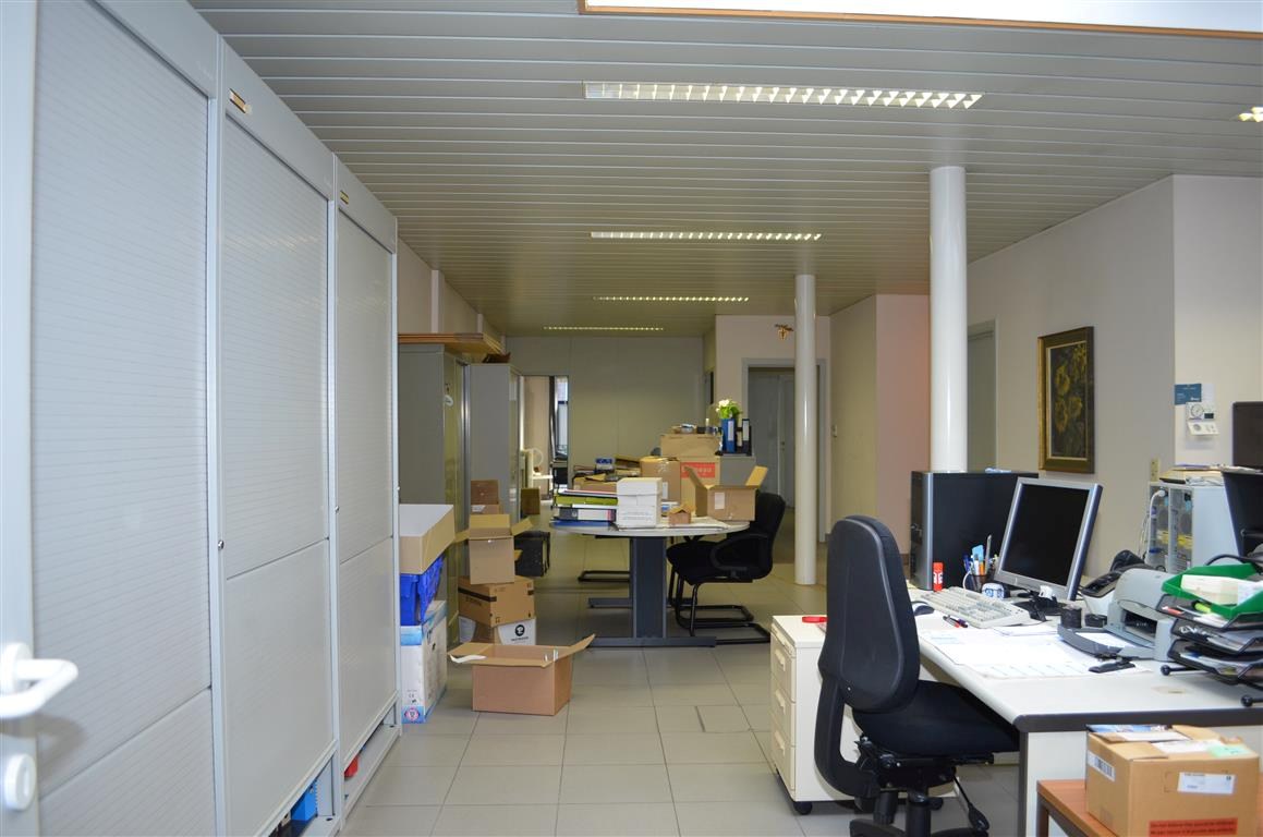 Indeling : afgesloten inkomhall met beveiligd loket, ontvangstruimte vooraan, grote open bureelruimte/vergaderruimte achteraan, apart toilet, aparte keuken en diverse bergruimtes of burelen.